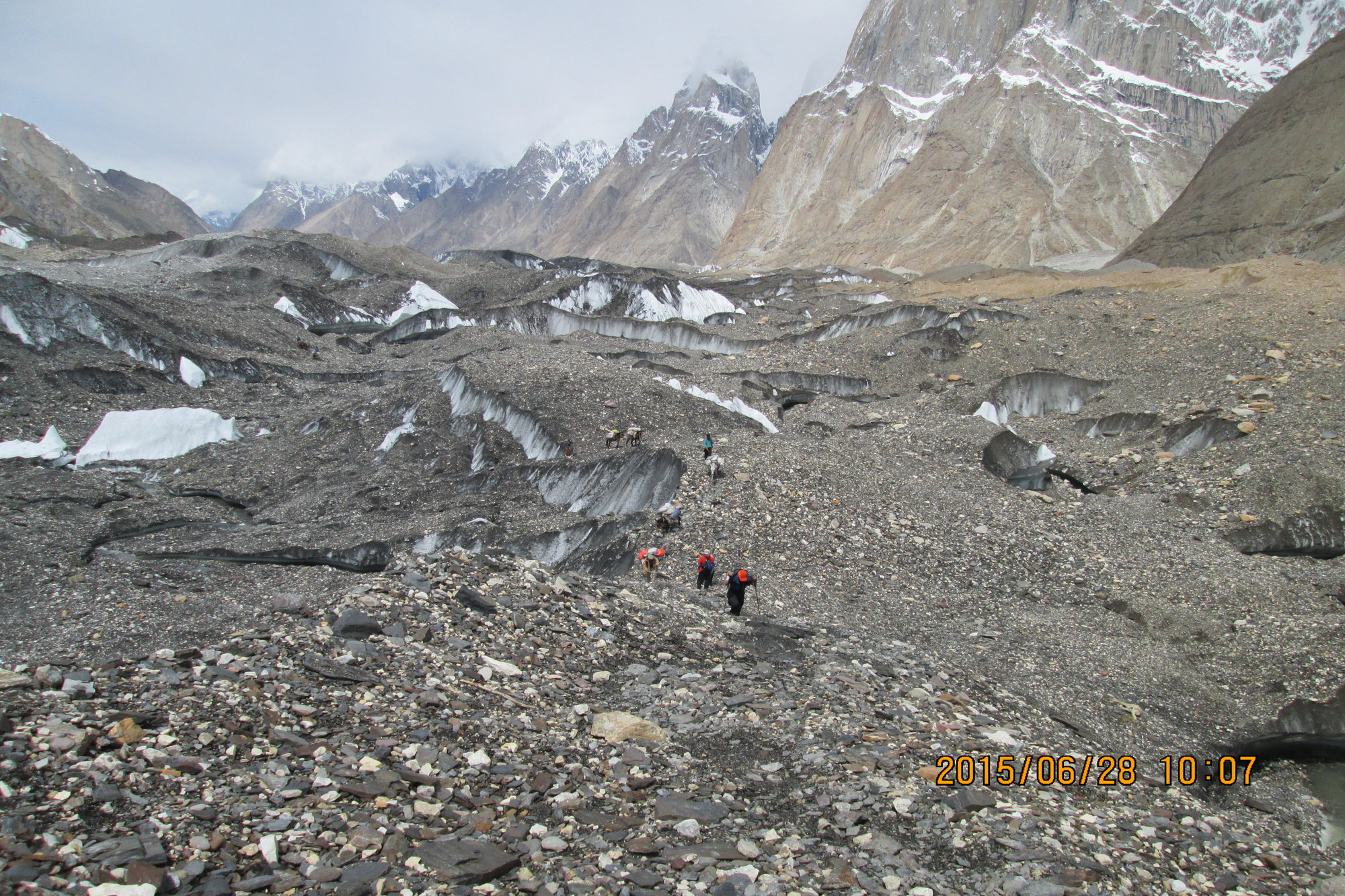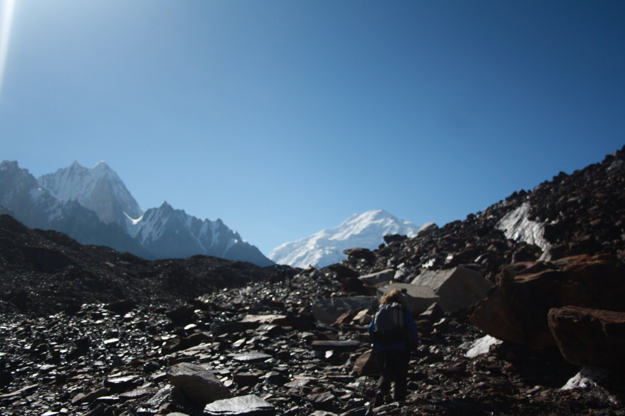 Step onto the mighty Baltoro Glacier. Terrain becomes rocky and uneven.