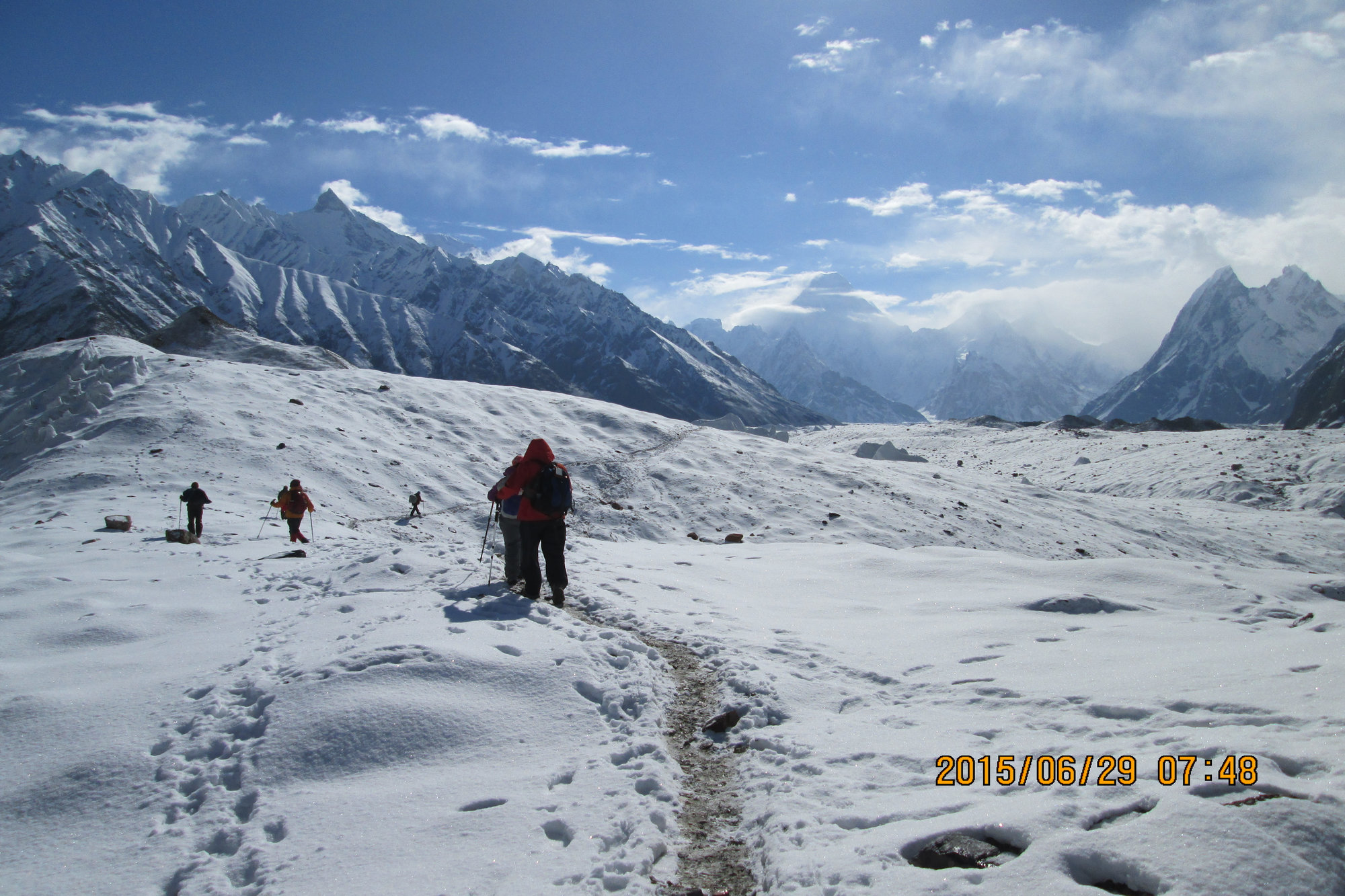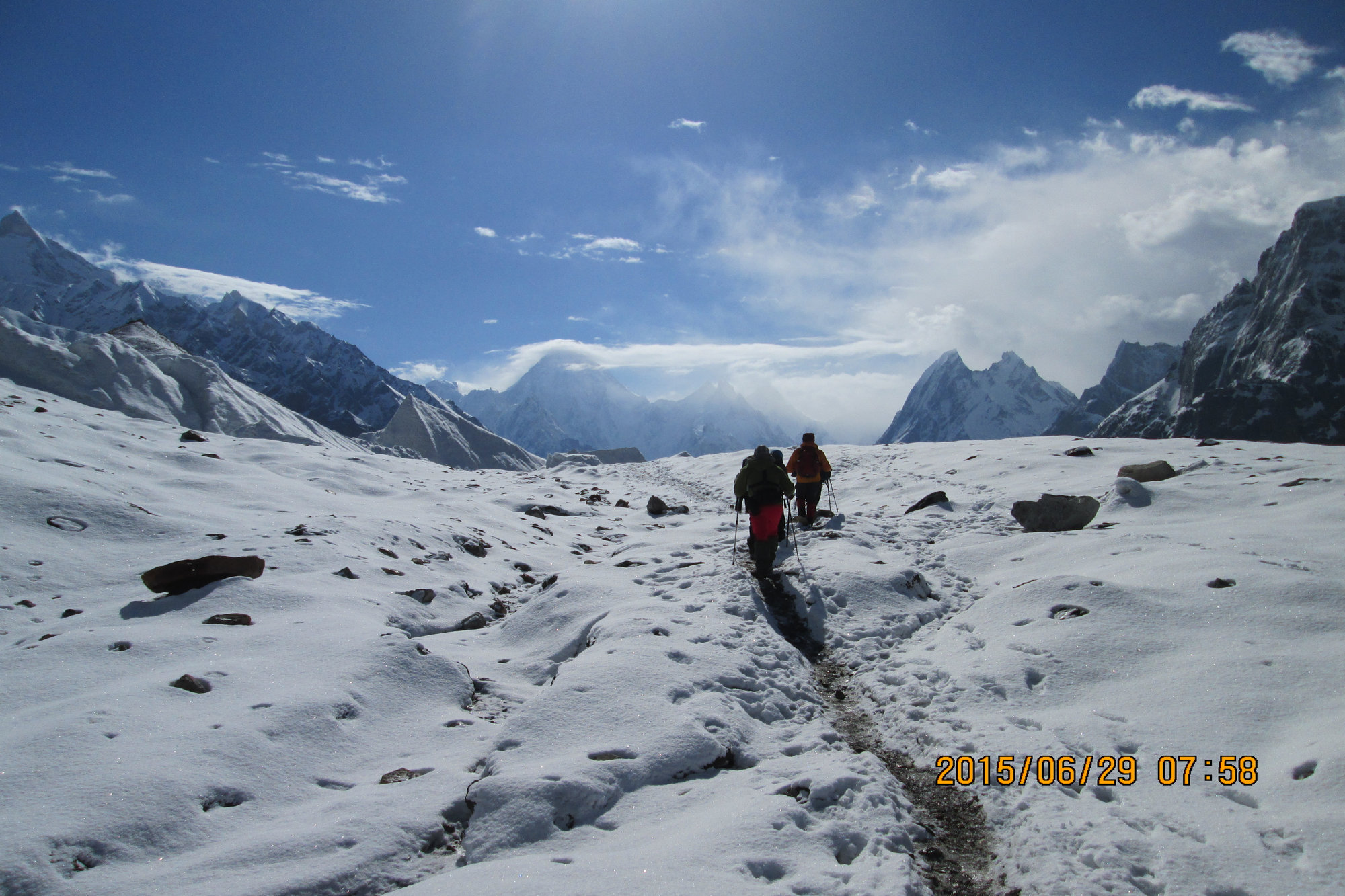 You are now walking directly on the glacier’s center. Masherbrum (7,821m) appears to your right.